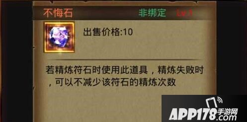 鉴于符石精炼失败会消耗符石精炼次数,所以系统特别推出了不悔石这以道具。使用不悔石进行精炼,失败时不会扣除精炼次数。不过如果精炼成功1次或没有成功过,是不可以使用不悔石的,最少要精炼成功过2次及以上才可以使用不悔石。精炼成功过2次-8次,可分别使用1-7颗不悔石。