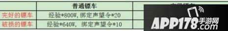 镖车分为普通镖车和高级镖车,高级镖车完成任务的奖励高于普通镖车,领 取镖车后可在镖师处花费元宝来强化镖车。每个职业接到的镖车属性不同,接到镖车是为完整状态,当镖车的血量降为0时,则镖车消失并视为完成任务,且会有一次爆落物品。