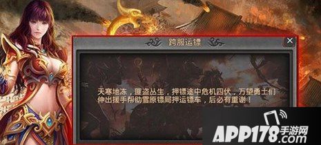 天寒地冻,匪盗丛生,押镖途中危机四伏,诚邀玩家们伸出援手帮助雪原镖局押运镖车,后必有重谢!游戏新增的跨服运镖玩法以魔龙雪城为背景地图,于每周五8点至20点开放,随机4个服务器参与副本活动,开放期间每个服的玩家最多可进入400人,4个服务器总共最多可进1000人。正式进入副本接取镖车任务之后,将镖车安全带回本方安全区就可以获得丰厚的奖励。但是,在任务过程中镖车被击破被视为任务失败;并且出现下线或者掉线的情况超过1分钟,也直接视为任务失败。