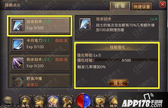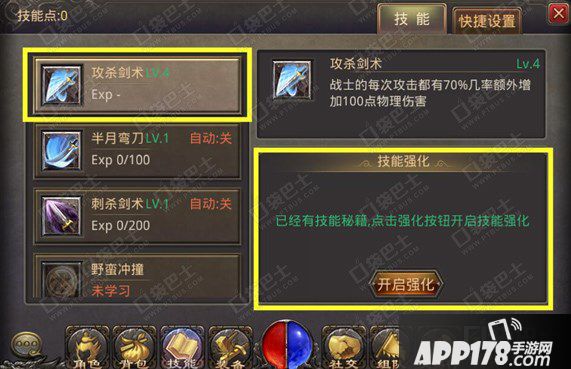 (技能在没有达到满级的时候,是没有强化按钮的,此时需要多使用该技能打怪,来提升该技能的经验值)