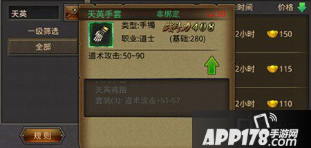 2、首饰3件套:手镯、戒指、项链。首饰套主加输出。每个职业都有两套可供玩家选择,俗称天地套,道士天英、地英套,法师天魁、地魁套,战士天雄、地雄套。一般来说,地套属性较高,加的输出很明显,比较难弄,市场上价格也高。
