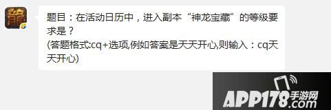 题目:在热血传奇手机版活动日历中,进入副本“神龙宝藏”的等级要求是?