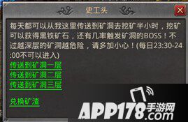 在毒蛇山谷边上的山谷矿区一层中,我们可以找到名为史工头的NPC,通过史工头我们可以自由的选择时间进入挖矿副本中哦(除了每天的 23:30-24:00),而且矿洞还是分为三层的,每层可以挖到黑铁矿石的等级上限和矿洞的层数是有关的,在矿洞三层我们就可以挖到纯度3的黑铁矿石。