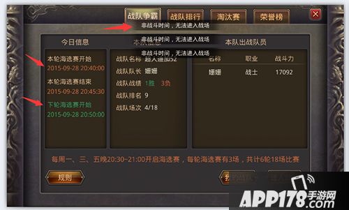 9月15日——9月21日20:00,这期间玩家可以【创建战队】或【加入他人的战队】。每个战队最多可5个人,当战队内容人数超过3个人时,战队内需拥有战士、法师、道士的职业。