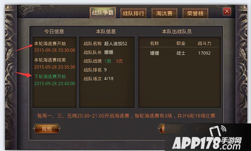 9月21日———10月2日期间,每逢周一、三、五的20:30——21:00为比赛开打时间,比赛一共打6期,详情如下。