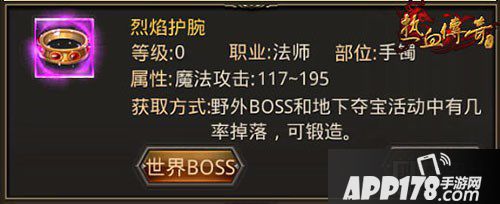 烈焰护腕:魔法攻击117-195,玩家可以同时装备2个烈焰护腕,即可获得高达234-390点基础魔法攻击加成,与烈焰项链提供的属性加成一致。烈焰护腕可以通过锻造获得,玩家花费9个金刚石即可锻造出烈焰护腕,此外野外BOSS和地下夺宝活动中也有几率掉落。
