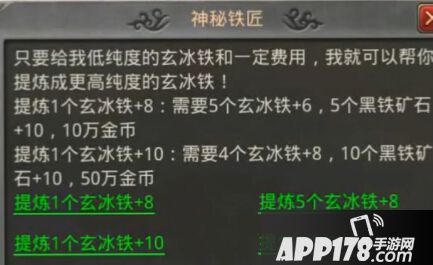 +8玄冰铁提纯方法:提取一个需要5个+6玄冰铁,5个+10黑铁矿石,10万金币