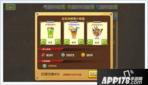 副本扫荡功能会在角色等级到达20级时自动开放,同时开放的还有饮料系统。副本扫荡可以免除操作过程直接获得副本掉落的物品以及经验奖励。但是副本扫荡需要消耗一定的饮料,饮料可以在果汁店榨汁或使用钻石购买水果再行榨汁获得。要知道,使用饮料扫荡可以获得手动挑战普通副本9~24倍的经验以及铜钱呦~