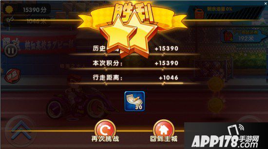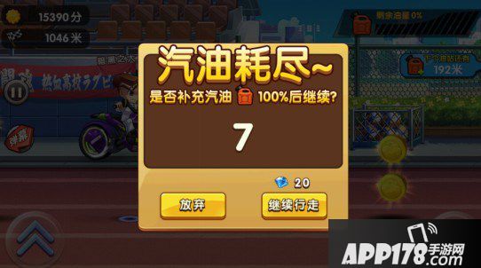 玩家在油量耗尽之时,可以选择利用钻石“再续前缘”继续闯关,或者是见好就收放弃挑战;不过若是碰到差一点就可以打破自身记录的时刻,还是不要犹豫点击继续吧!