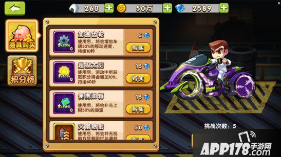 对啦,偷偷告诉各位一个小秘密~在挑战开始前,玩家可以在操作界面中购买各种增益道具哦!有“超级太阳”“便携油箱”“加速齿轮”等,功能也是极为强大,各有千秋~同志们可以根据情况有针对性的进行购买,强化自己的战斗力!