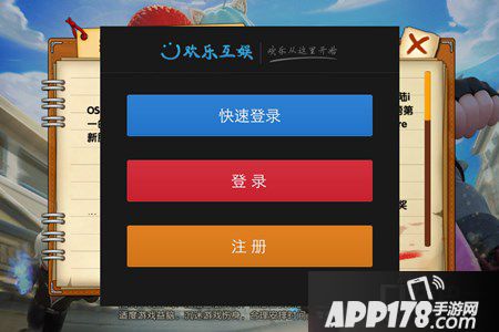 大家可以看到下图,我们登陆游戏的时候会有三个选项,如果有欢乐互娱账号,强烈建议大家选择“登录”选项,如果没有账号建议大家通过“注册”账号进行登录。如果大家当时登陆选的是“快速登录”,那也没有关系,请看下面。