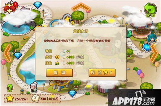 小苍老师一路走啊走,走到了一栋建筑物旁边。停留在建筑物旁边时,可以对建筑物可消耗每一个关卡结算时所获得的评星进行投资或装修,投资过的建筑每小时会产出收益,投资越多,自然产出也就越高了。需要注意的是,评星同一关卡最多只能产出三颗,无法重复获得的,SO,要获得更多的星星,一定要一路坚持完成主线任务开启更多关卡哦。