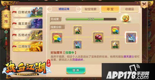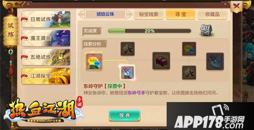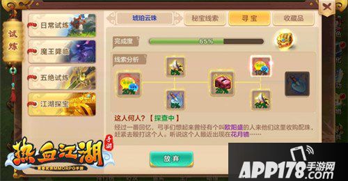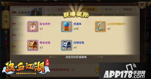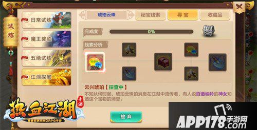 江湖探宝在《热血江湖手游》中是一个很有意思的玩法它类似于宝物收集同时还可以提升我们的属性和战斗力。那么在那里可以弄到寻宝的线索呢?首先我们要找的第一位就是江湖客栈*韦大宝,在这里有很多大神出售材料。在购买完成后每天早上的五点会刷新一次,当然我们也可以用元宝刷新不过实在不太划算。所以大家一定要记得及时购买。集齐了琥珀云珠的材料我们就可以开始寻宝了。