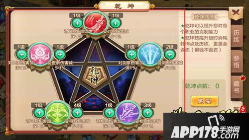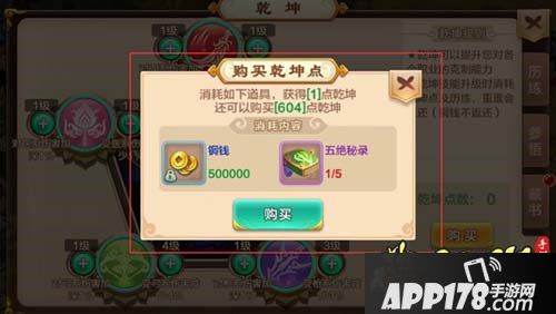 另外购买乾坤点需要铜钱+五绝秘录(在每日活跃宝箱、太玄碑文活动、五绝秘录残篇合成以及百道峡领的天魔神君出兑换获得)。
