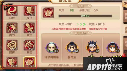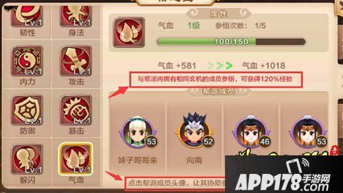 并且每天玩家只能参悟5次,每次参悟成功会获得100经验值,相同的人只能协助玩家参悟一次!(PS:与帮派内拥有相同玄机的成员参悟,可获得120%的经验。
