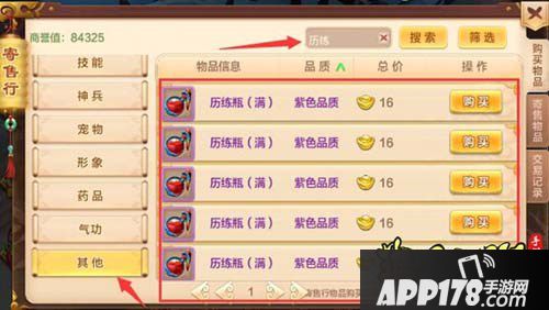 ③可在售卖里买其他玩家寄售的历练瓶(历练可以通过空的历练瓶提取,然后通过售卖寄售给其他玩家);