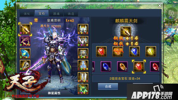 玩家角色可佩戴包括法宝在内的十一件武器装备,而每件装备上可已镶嵌四颗不同的宝石。一级的攻击、力量、体质、敏捷、防御宝石,可增加十九点对应属性值,一级生命宝石则可以增加417点生命值。五颗相同属性相同等级的宝石,就可以合成为一颗此属性的高等级宝石,高级宝石相对低级别宝石,提升数值会增加很多,确定出自己的宝石组合方式,不断积累宝石数量,提升宝石等级就可不断提升玩家角色的基础属性数值,来提升战斗力。
