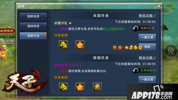 国家任务是《天子》手游玩家每天最大量的经验值来源,快速解决国家任务,等待数量再次刷新,对于玩家角色等级的提升将有着巨大的帮助。