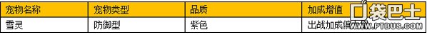 全身雪白,记着一个红色围巾的小熊。做着各种滑稽好笑的动作,是不是很萌呐?其实小熊除了很萌以外,属性也特别给力。雪灵属于防御型灵宠,萌萌的外表之下有着憨厚敦实的心灵。出战加成偏力量,算是紫色宠物中的佼佼者!