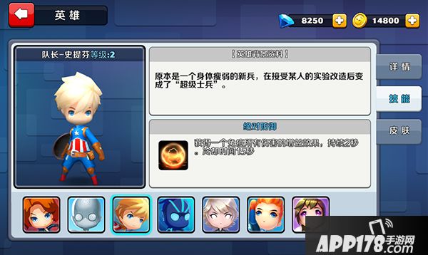 使用技巧:皮厚血高的米国队长,在场上有很好的生存能力,其英雄技“绝对防御”尽量作为保命技能在危机时刻使用。米国队长比较适合PVE玩家,但其属性成长在PVP中表现一般。