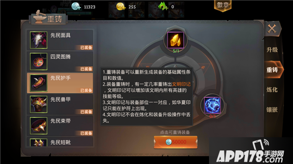 大家可以对自己装备的基础属性进行重铸,装备重铸的时候有一定几率重铸出文明印记,这是好东西,可以增加该文明内所有英雄的技能等级,相当给力。