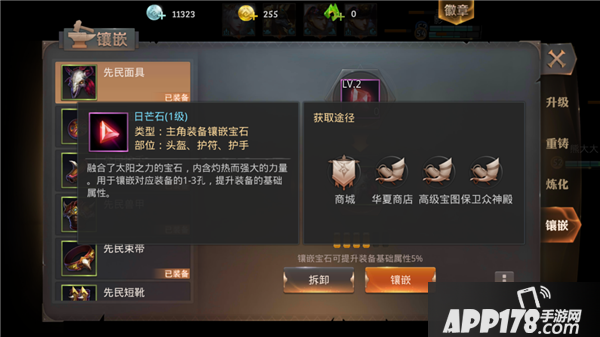 装备镶嵌,顾名思义,就是在装备上打宝石,大幅提升装备的能力。镶嵌分为两种,一种是头盔、护符、护手等装备需要的日芒石镶嵌,另一种是衣服、腰带、鞋子等防具上的月华石镶嵌。