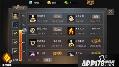 大家可以通过每天的那个活力值获得金币,只要你活力值达到一定数值,就可以获得定量金币。不过这比较耗时间,忙人勿选......还有法老陵墓、亚特兰蒂斯或者天下英雄这样的活动也是可以获得金币的哟,只要你花一定时间去玩玩,金币很快就进账啦!