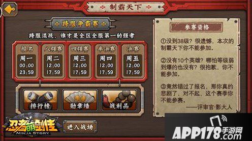 制霸天下定于每周举办一届,玩家等级达到38级,并且英雄数量在10个便可以报名参赛。从周一至周五,全部赛程划分为报名、八强赛、四强赛、半决赛、决赛。除周一全天报名外,正式比赛都在12:00至17:59期间进行。自动托管玩家角色进行战斗的方式,不用让玩家时时留意开赛时间,只要轻松享受游戏便可以在五天时间内角逐全国第一人,成就无上威名。