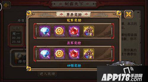 在全部赛事结束后,系统将会根据玩家的排名进行奖励的发放。获得冠军、亚军、四强、八强的玩家可以依次获得极为丰厚的钻石、金币、血石、经验药水的奖励,而所有报名的玩家,即使没有夺得名次,也可以领取参与奖励。同时,在勋章馆中,玩家还可以根据自己制霸天下的参与次数、夺冠、胜场次数、成功支持次数、荣誉积分来领取极为丰厚的勋章奖励。