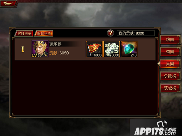 左上角第二个图标是荣耀大厅,这里面总共有5个榜单,分别是吴国,蜀国,魏国,还有杀敌榜,筑成榜。如下图所示
