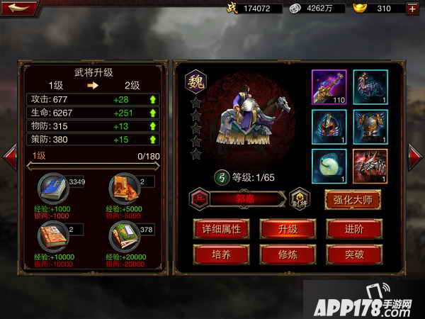 上图左下方可以看到4种经验书,武将升级全部靠吃书完成。但武将级别不可需小于等于主公级别。