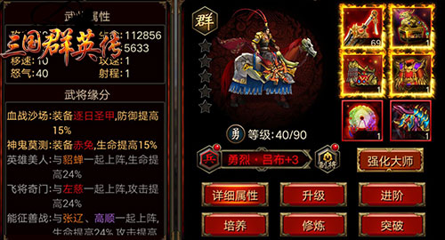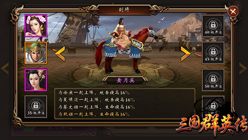 在《三国群英传》手游版中,加入了缘分系统的概念。顾名思义,缘分系统指定的是三国中有羁绊的角色同场上阵,将会获得额外的属性加成。比如赵云与关羽、马超一同共同上阵,将获得名为“蜀之上将”的强力Buff,生命提高24%、攻击提高24%。以此类推,像三国之中孙策、大乔,吕布、貂蝉,周瑜、小乔这样的原配夫妻,关羽、张飞、赵云、马超、黄忠这样的五虎上将,一起排上阵的话,会发挥出意想不到的威力。