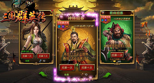 万人无敌的张飞、智勇双全的张辽、轻骑劫营的甘宁……在《三国群英传》手游中,上百种三国名将都将有机会成为你的伙伴,陪你一起上演新的乱世传奇!在游戏中,玩家可以靠副本掉落、招募、武将商店、竞技场兑换、黄巾之乱兑换等多种方式获得武将。当然,招募系统是最快的方法,类似于卡牌类手游中的抽卡。武将分为绿、蓝、紫、橙、红五种,依次序属性增强。比如张松、糜芳之流是绿色的,陆逊、马超是橙色。