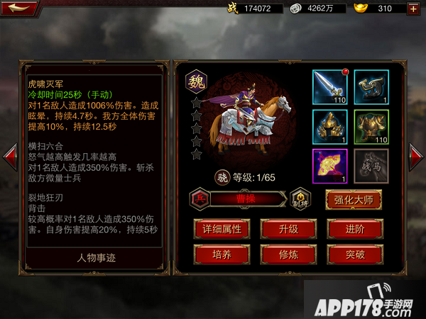 虎啸灭军,对于一名敌人造成大量伤害,并眩晕长达4.7秒,提升全体伤害。