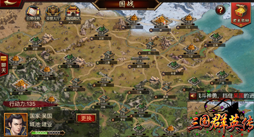 选择完国家后,玩家会出现在己方势力的城池上,此时你已经是所属国家的一支部队了。点击左上角的日常任务,会出现任务列表,完成后将不仅可获得丰厚的奖励还能赢取积分。国战日常每天重置,玩家达到一定积分还可以领取宝箱。左上角第二个图标是荣耀大厅,这里面总共有5个榜单,分别是魏、蜀、吴三国的贡献度排名,此外还有杀敌榜、筑城榜。国战玩法有自己的国战商店,玩家不仅可以使用在国战中获得的军功来兑换经验书和其他资源,还能兑换红色品质的武将碎片。