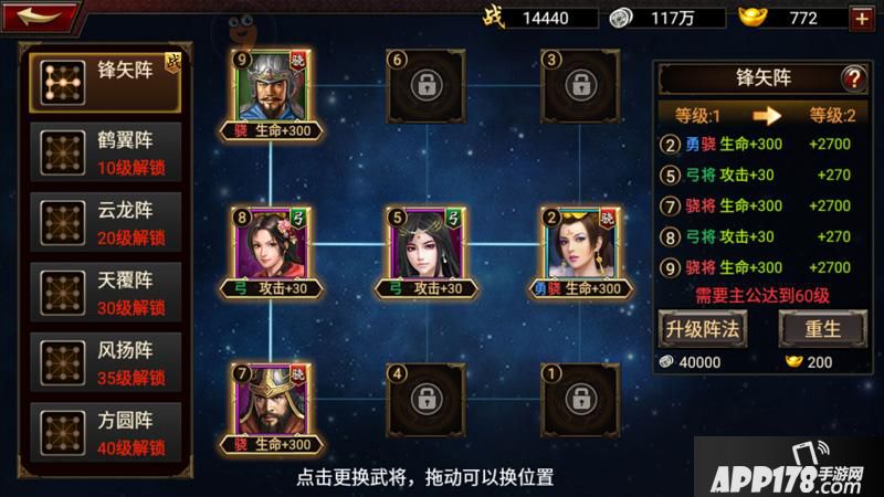 游戏初始的阵形是锋矢阵,到了10级开始就可以解锁新的阵型了。两军交战,阵法对战斗的影响是很大的。主公到达60级之后就可以对阵法进行升级,只需要耗费银两就可以提升阵法属性,如果不想用这个阵型了,也可以花费元宝进行重生。