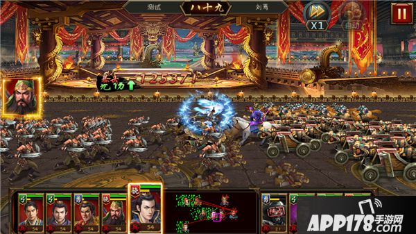 战斗中武将的出场顺序是在战前根据武将的定位和能力进行排兵布阵。战场搭配绝非只看单体数值,最常见的例子莫过于侧翼骑兵的奔袭包抄,打破常规阵形,实现绕后包夹的套路。