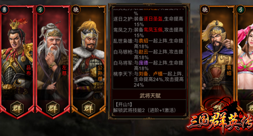 在《三国群英传》手游中群雄武将的实力还是很强大的,红将有两名:吕布和左慈,橙将有:公孙瓒、袁绍、貂蝉、于吉、董卓、华佗、华雄、张角、卢植。紫将与其以下品质的武将在此就不做说明了。需要说明一下的是,不是只有相同国家的武将之间才会有缘分羁绊。例如:公孙瓒的武将缘分中显示,与袁绍一起上阵,生命提高18%;与赵云一起上阵,攻击提高18%;与庞德一起上阵,生命提高18%。但袁绍是群雄、赵云是蜀国、庞德是魏国。