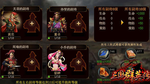 在《三国群英传》手游新版本中,达到70级的玩家可以开启双副将系统,就是每个上阵武将有1个左副将和1个右副将。左右副将位置必须配置橙色以上品质(包括橙色)的武将才能激活属性加成。左右副将的位置可以配置任意品质颜色的副将,但只有橙色以上品质才能够激活属性加成。点击“助阵”按钮,可见助阵副将界面,在助阵副将界面,选中副将点击经验书可可直接为助阵副将升级。4个上阵武将,一共需要8个橙色品质以上的左右副将才能激活。