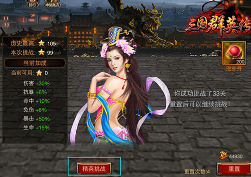 三国无双玩法一直是《三国群英传》手游中非常受欢迎的玩法之一,在新版本中该玩法推出了全新的精英挑战模式,入口就在在三国无双的主界面中。玩家只要开启三国无双功能后即可进行三国无双精英挑战。精英挑战规则为:玩家每天可免费挑战3次,可花费元宝购买挑战次数。每天的购买次数有上限,购买次数上限随vip等级增加,等级越高,每天可购买的次数越多。每天0点刷新免费次数和购买次数。玩家可获得首胜奖励:第一次通关获得的奖励--大量威名和关卡奖励:每次通过后获得的奖励--银两、璞玉、九天玄铁、神装精华等。