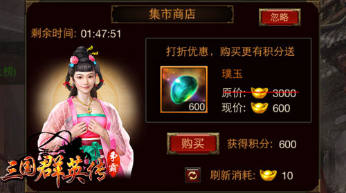 1、集市商店:人民安居乐业,市场繁荣。玩家进入集市商店,可购买相关道具。另外可花费10元宝刷新商品,商品只能购买1次,购买后不能刷新。