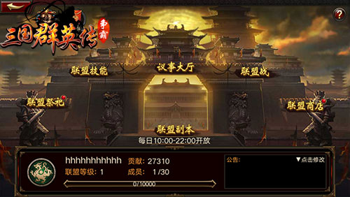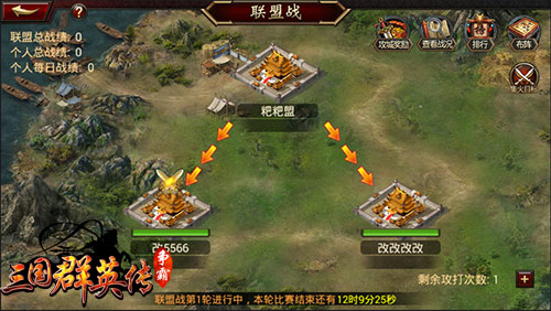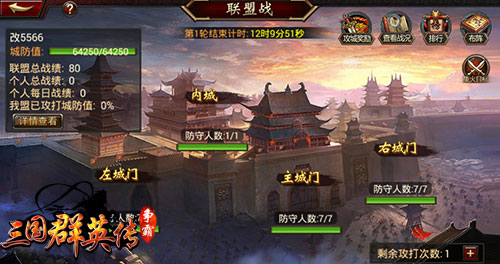 作为《三国群英传-争霸》1.7版中最重要的“联盟战”将对联盟等级达到5级的联盟开放,每2周开启一轮。首先,由联盟中的盟主和副盟主决定是否报名参加,报名条件为本联盟内50级的玩家数不少于22人,报名时间为周一0点到24点。若盟主或副盟主等级未到50级,他们可以进入到联盟战,可以报名,可以布防,可以使用“集火目标”,开战后也可以进入,但是无法参加战斗。报名后,在联盟战期间,联盟不可解散,新加入联盟不足24小时无法参加联盟战。