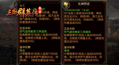 红将化神的属性加成机制也同上述橙将一样,唯一不同的就是红色武将进阶后仅提升技能属性,不会变色。主公们从此不用再为武将只是橙色的而郁闷了,同时也不用为红色武将达到一定程度就无法突破而烦恼。当然,“化神”玩法除了对武将等级有要求外,还需要化神丹和部分武将碎片、将魂等物品。随着主公们的化神等级的提升,需要的数量也是不同的。