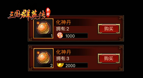 化神丹可以从武将商店中刷新出来,刷新出来的化神丹有两种购买方式,一是将魂,二是元宝。根据刷出的化神单数量,需支付对应的将魂和元宝。