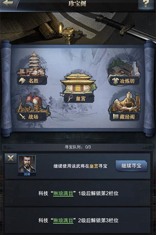 除了通过升级建筑,训练士兵,招募良将这些途径来提升主公战力外,通过研究科技和赐予武将宝物也将让主公实力得以飙升。《三国群英传-霸王之业》中的科技树分为军略、政略、城池三类研究方向,需要注意的是,在科技研究中同样需要对重点科技进行优先升级,如想要提升部队战力可优先升级军略中的【调兵遣将】技能;升级政略中的【高级采矿】可开采到更高级的矿洞;而升级城池【安营扎寨】科技,则可获得建造要塞的权利。此外,通过赐予武将宝物也是提升主公战力的一个重要方式。主公只需派遣魅力值≥70的武将前往珍宝阁中的皇宫、战场、名胜、藏经阁、冶炼坊这五个寻宝点寻得功能各异的宝物,在其中所寻得的宝物便会置入物品栏中,并将赐予武将,使其获得属性和技能加成,从而获得战力的极大提升。