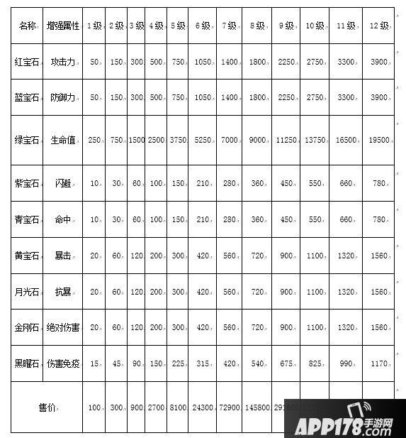 每一种颜色的宝石带有一种属性,其中红宝石可以增加队伍攻击力,蓝宝石可以增加队伍防御力,绿宝石可以提高队伍的生命值,紫宝石可以提高队伍的闪避数值,青宝石可以提高队伍的命中数值,黄宝石可以提高队伍的暴击率,月光石可以提高队伍的抗暴率,金刚石可以提高队伍的绝对伤害数值,黑曜石可以提高队伍的伤害免疫数值。宝石等级越高,相对应所增加的属性就越多,其中,黄宝石、月光石、金刚石每升1级所提高的数值要比其他宝石多,相应所能提高的战力也多。值得一提的是,宝石还有相应的售价,价格也随着宝石等级的提高而相应增加。由下表可以清楚的了解各种类型和等级的宝石对武将的属性加成以及宝石的销售价格。(以下数据根据玩家版本不同或有所不同)