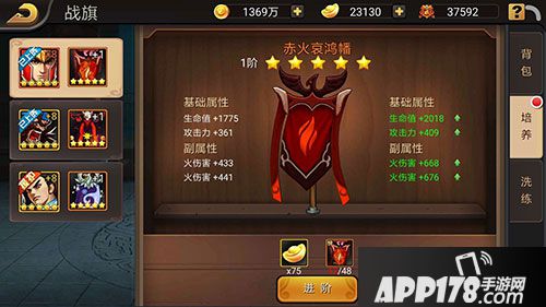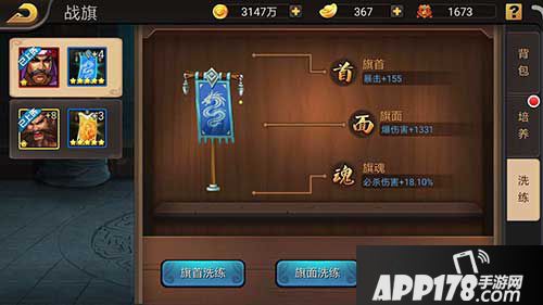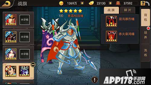 游戏主界面养成里面的新成员战旗,大家一定不会陌生。点进去之后,视图的左侧是玩家们武将战旗穿戴情况中间是选中武将,如果拥有战旗则会插在武将身旁。由于每名武将都能带一面战旗,因此战旗的作用也是仅对单个武将有效。右侧横列是显示中拥有的战旗及碎片数量,纵列是培养和洗练。