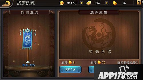 洗练属性有三个分别是2阶解锁的旗首属性,3阶解锁的旗面属性和4阶解锁的旗魂属性。洗练需要消耗洗练石,官方提供了单次洗练和10次洗练,10次洗练消耗的洗练石可以打95折,类似于探宝系统。这里小编建议大家还是有单次洗练吧,除了折扣太少之外,还有洗练出你需要的属性很可能就在下一次而不是在10次的最后一次。洗练出的属性根据强弱也有颜色之分,但不会超过战旗本身的颜色,也就是说紫色战旗最多洗练出紫色的属性,而不会出现橙色属性。