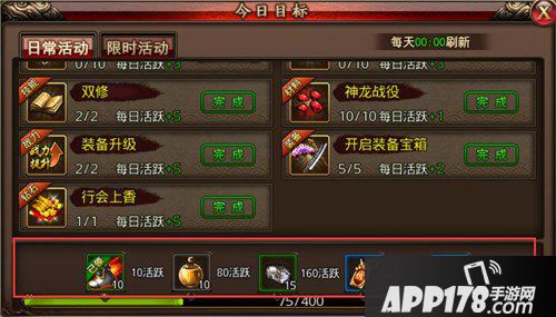 完成行会上香还可以获得5点活跃值。不同活动对应的活跃值可以在【今日目标】中查看,达到相应的活跃值可以获得小飞鞋、强效太阳水、黑铁矿石、试炼凭证和大量钻石。