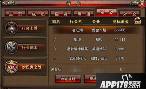 沙巴克城战是咱们玛法勇士的终极战场,刺激到大冬天打一场可以出一身汗。竞标规则和攻城规则都可以在行会界面找到。竞标时间为沙巴克城战开启周的周四9点到周六21点,竞标成功后兄弟们就可以摩拳擦掌不战不休了。